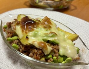 ⑤調理したじゃがいも、枝豆、豚挽き肉を和え、耐熱皿に入れてピザ用チーズを上からかけ、オーブントースターで焼き目がつくまで5分程焼いたら完成です。